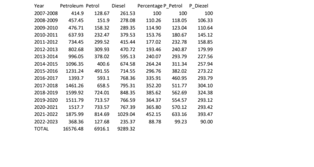 डीजल पर टैक्स केे आंकड़ों के अनुसार 2007-08 में जहां 261.53 करोड़ सरकार को टैक्स मिला, वहीं 2018-19 मेें 224.38 प्रतिशत बढ़कर 848.35 करोड़ हो गया जबकि 2019-20 में इसमें कमी होकर 2007-08 के मुकाबले 192.42 प्रतिशत अधिक 766.59 करोड़, 2020-21 में बढ़कर 193.42 प्रतिशत 767.39 करोड़ टैक्स मिला हैै। वर्ष 2021-22 में बढ़कर 293.47 प्रतिशत अधिक 1029.04 करोड़ टैक्स मिला है जबकि वर्ष 2022-23 में मई 2022 तक केवल 2 माह 235.37 करोड़ रूपये टैक्स मिला हैै।