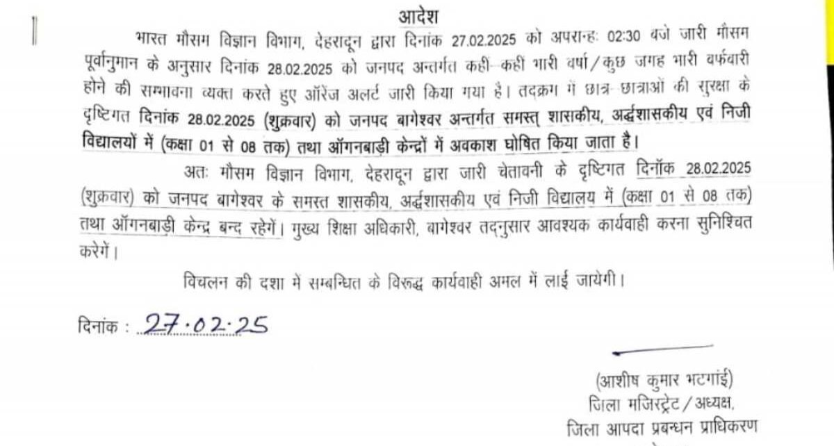 इसी को देखते हुए जिला मजिस्ट्रेट/अध्यक्ष, जिला आपदा प्रबन्धन प्राधिकरण आशीष भटगांई ने छात्र छात्राओं की सुरक्षा के दृष्टिगत 28 फरवरी को (शुक्रवार) को जनपद अन्तर्गत समस्त् शासकीय,अर्द्धशासकीय एवं निजी विद्यालयों में (कक्षा 01 से 08 तक) तथा ऑगनबाड़ी केन्द्रों में अवकाश घोषित किया गया है।